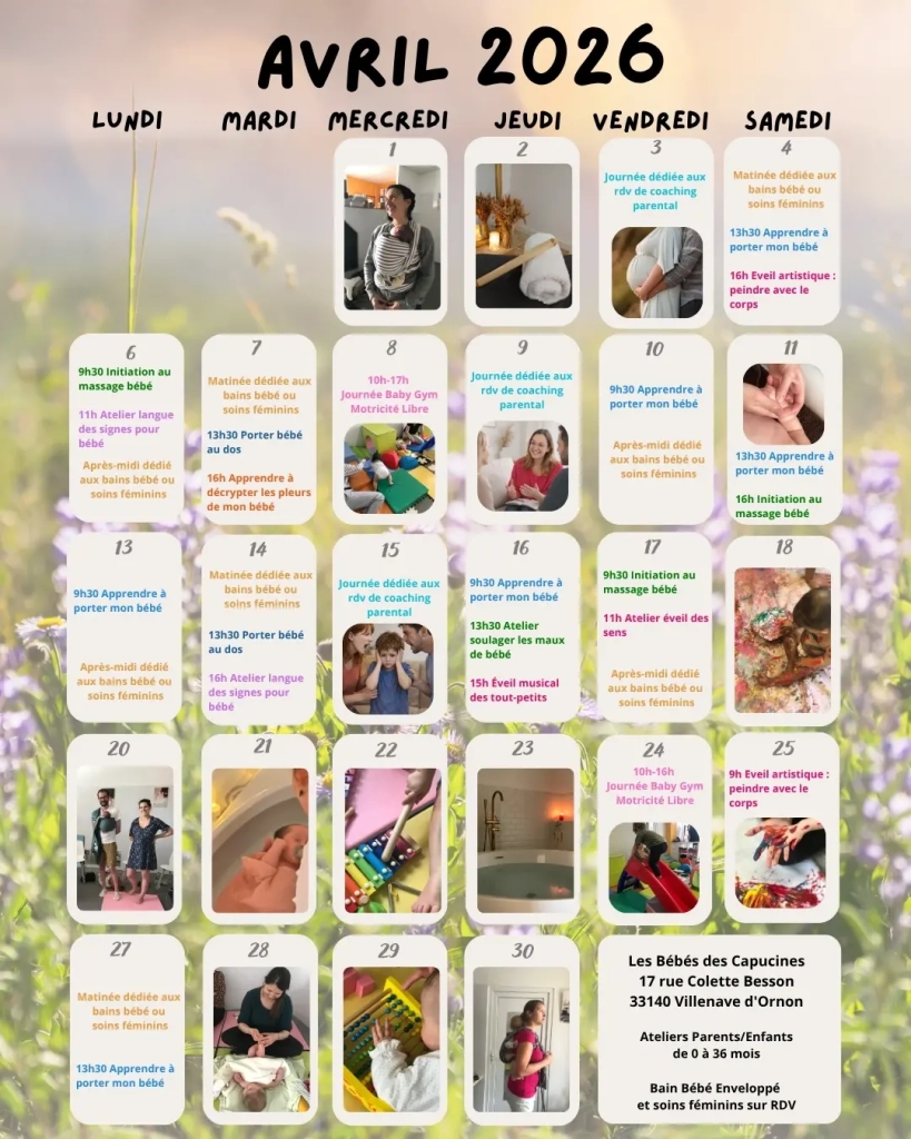 Chaque mois, nous vous proposons une sélection d’ateliers pour explorer, s’amuser, se détendre et grandir ensemble. Massage bébé, baby gym, motricité fine, éveil sensoriel, bébé signe, ateliers cuisine ou encore bain enveloppé… il y en a pour tous les goûts, tous les rythmes et tous les bébés.